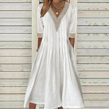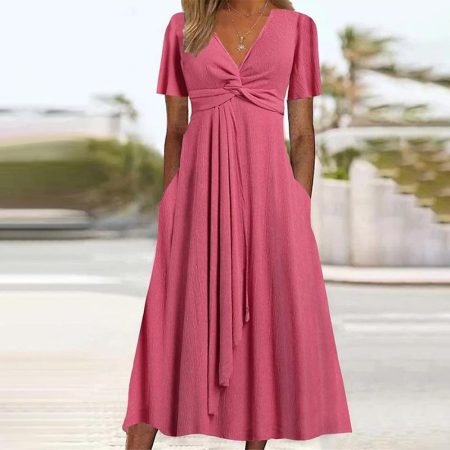 $67.99Original price was: $67.99.$50.99Current price is: $50.99.Description: Pattern Type: Plain V-neck Sleeve Length: Short Sleeve Dress Length: Midi Silhouette: A-line Side Pockets Material: 35% Elastane, 65% Rayon Machine Washable Size Chart: Size Bust Length Sleeves inch cm inch cm inch cm S 36 92 46 117 5 12.5 M 38 96 47 120 5 13 L 40 101…