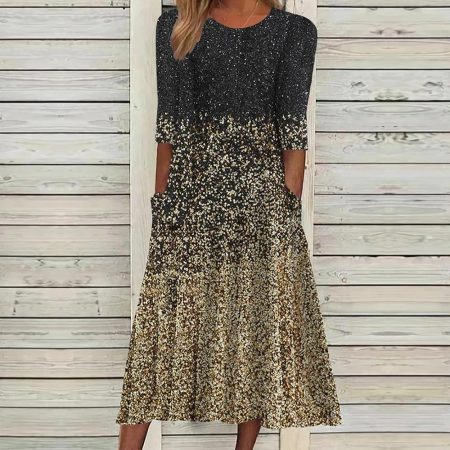 $74.99Original price was: $74.99.$49.99Current price is: $49.99.Description: This sophisticated midi dress says it all, with ombre green stripes running vertically down the mid-calf silhouette. The short sleeves with a luxe swirling ribbon print and v-neck give it a glam detail. The cinched bodice with ¾ sleeves complements the flared hem. Neckline: Round Neck Sleeve Length: 3/4 Sleeve Dress…