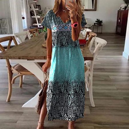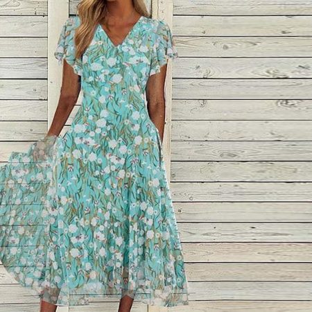 $64.99Original price was: $64.99.$47.99Current price is: $47.99.Description: Dress Length: Midi Neckline: V-Neck Sleeve Length: Short Sleeve Silhouette: A-line Pattern Type: Print Material: 35% Elastane, 65% Rayon Machine Washable Size Chart: Size Bust Length Sleeves inch cm inch cm inch cm S 38 96 52 132 9 24 M 39 100 53 135 10 25 L 41 105 54 138 10…