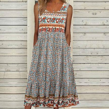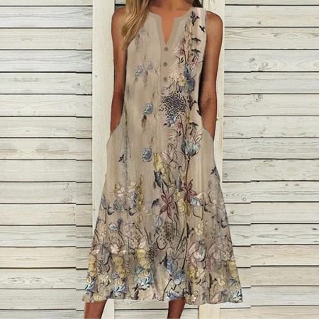 $58.99Original price was: $58.99.$42.99Current price is: $42.99.Description: V-neck Sleeve Length: Sleeveless Dress Length: Midi Pattern Type: Print Side Pockets Silhouette: A-line Material: 40% Elastane, 60% Rayon Machine Washable Size Chart: Size Bust Length inch cm inch cm S 35 90 46 117 M 37 94 47 120 L 39 99 48 123 XL 41 105 50 126…