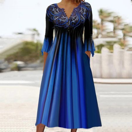 $69.99Original price was: $69.99.$48.99Current price is: $48.99.Description: Neckline: V-Neck Sleeve Length: 3/4 Sleeve Dress Length: Midi Silhouette: A-line Pattern Type: Print Material: 45% Elastane, 55% Rayon Machine Washable Size Chart: Size Bust Length Sleeves inch cm inch cm inch cm S 36 92 46 117 18 45 M 38 96 47 120 18 46 L 40 101 48 123 19 47…