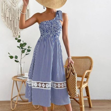 $64.99Original price was: $64.99.$46.99Current price is: $46.99.Description: Sleeve Length: Sleeveless Neckline: One Shoulder Dress Length: Midi Silhouette: A-line Pattern Type: Striped Material: 45% Elastane, 55% Rayon Machine Washable Size Chart: Size Bust Length inch cm inch cm S 32 82 44 112 M 34 86 45 115 L 36 91 46 118 XL 38 97 48 121 XXL 41 105 49…