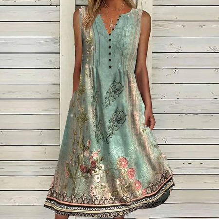 $71.99Original price was: $71.99.$47.99Current price is: $47.99.Description: Neckline: V-neck Sleeve Length: Sleeveless Pattern Type: Print Dress Length: Midi Side Pockets Silhouette: A-line Material: 40% Elastane, 60% Rayon Machine Washable Size Chart: Size Bust Length inch cm inch cm S 36 92 46 117 M 38 96 47 120 L 40 101 48 123 XL 42 107 50 126 XXL 45 115…