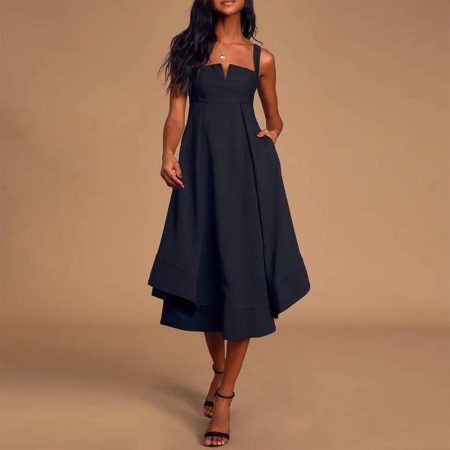 $66.99Original price was: $66.99.$46.99Current price is: $46.99.Description: This beautiful calf-length summer dress is a must-have for any fashionista, elegant and effortless. The straps and square neckline highlight the collar with a small cut-out v, perfect for showing off your lightweight necklaces. The chic empire waist and layered silhouette with side pockets make it versatile for any…