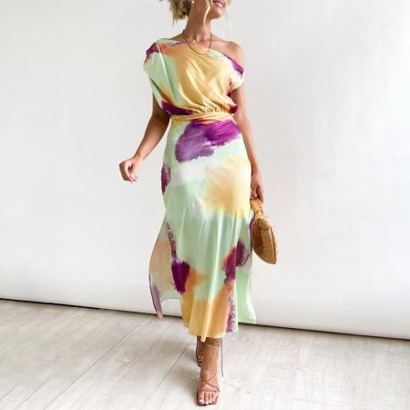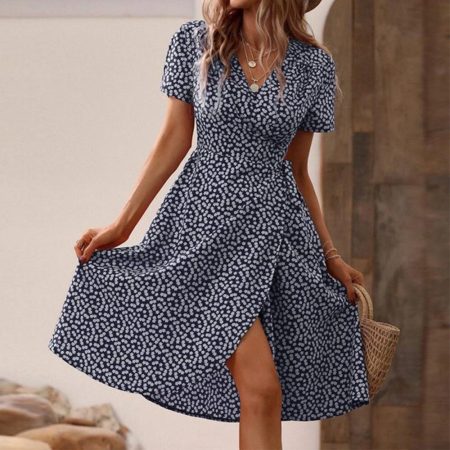 $63.99Original price was: $63.99.$43.99Current price is: $43.99.Description: Neckline: V-neck Sleeve Length: Short Sleeve Dress Length: Midi Silhouette: A-line Pattern Type: Print Thigh-high Side Slit Material: 45% Elastane, 55% Rayon Machine Washable Size Chart: Size Bust Length Sleeves inch cm inch cm inch cm S 36 92 44 113 7 19 M 38 96 45 115 8 20 L 40…