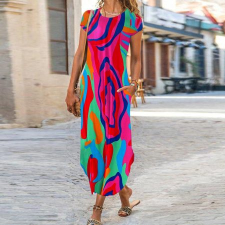 $60.99Original price was: $60.99.$42.99Current price is: $42.99.Description: Neckline: Round Neck Sleeve Length: Short Sleeve Dress Length: Midi Pattern Type: Print Silhouette: A-line Side Pockets 40% Elastane, 60% Rayon Machine Washable Size Chart: Size Bust Length Sleeves inch cm inch cm inch cm S 35 88 50 127 4 11 M 36 92 51 130 5 12 L 38 97…
