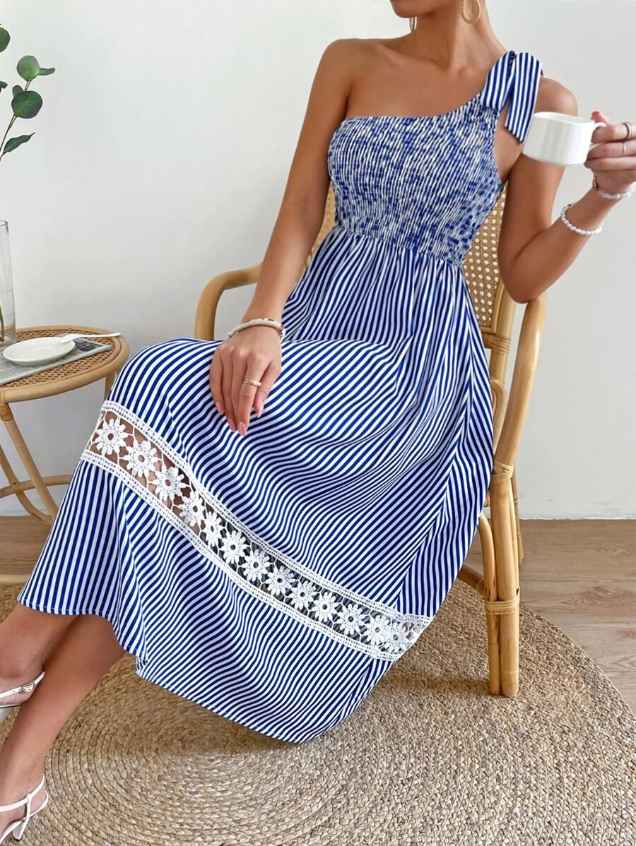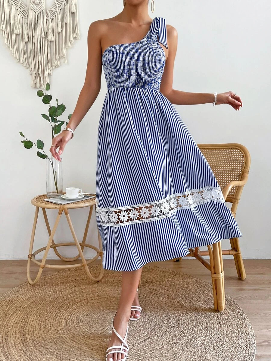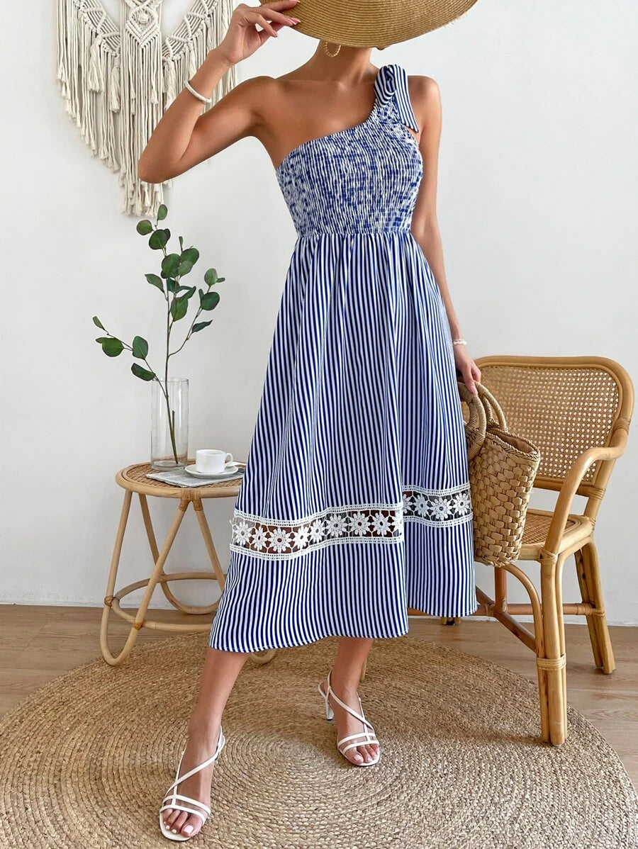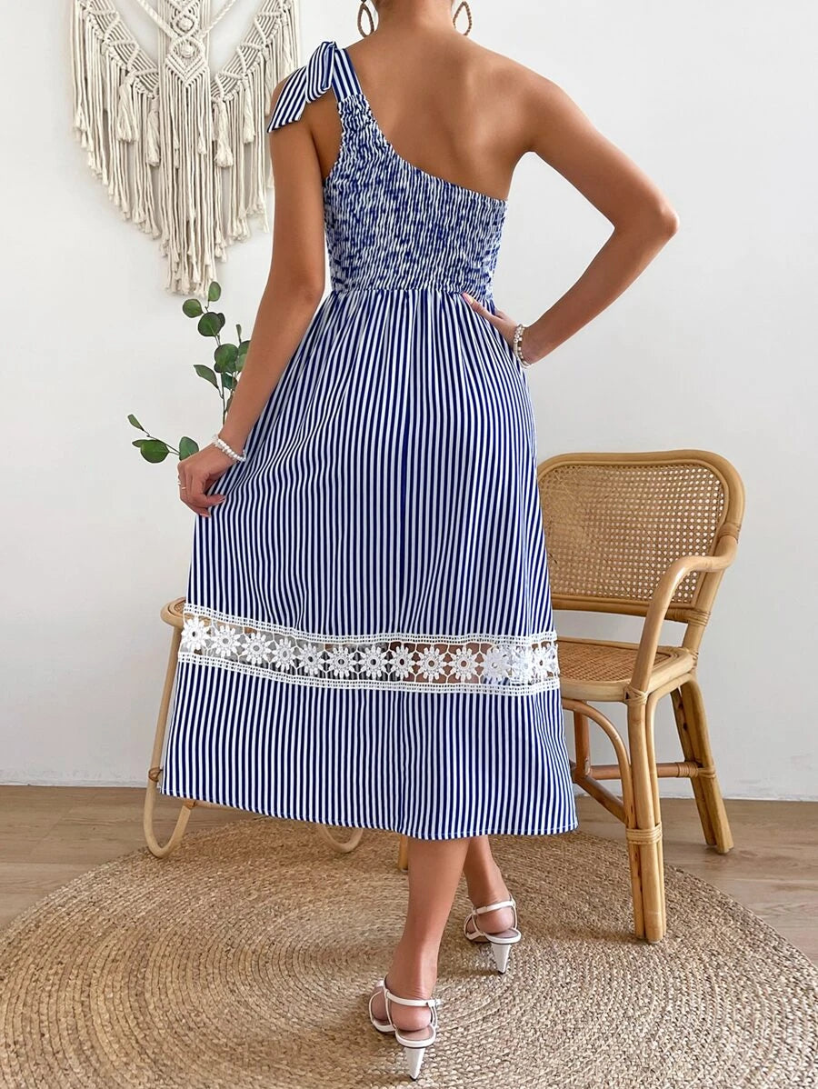 Blue Striped One Shoulder Midi Dress