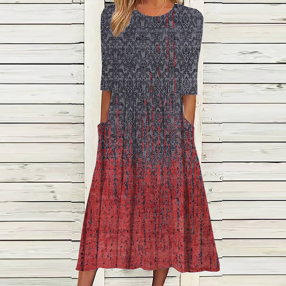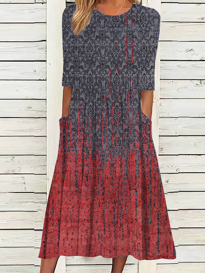 Description: This midi-length prairie dress will become your favorite go-to with its rich red to blue ombre ornate print. The crewneck collar and half sleeves make it easy to mix and match with a jacket. A loose-fitting waist with double side pockets and pleats finish the look. Pattern Type: Print Sleeve…